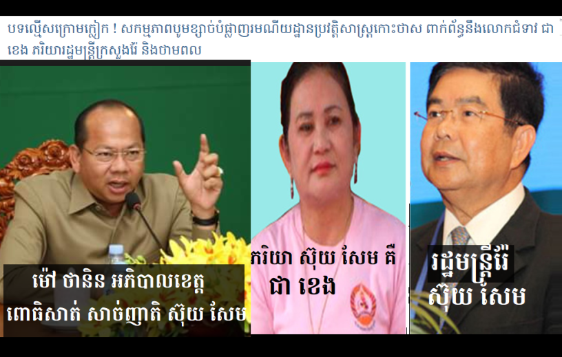 តាមរយៈទូរទស្សន៍ក្នុងស្រុក ដែលគាំទ្ររដ្ឋាភិបាលសព្វថ្ងៃ និងប្រភពពីមន្រ្តី បានរាយការពីខេត្តពោធិ៍សាត់ថា មានសកម្មភាពបូមខ្សាច់ បំផ្លិញបំផ្លាញតំបន់ រមណីយដ្ឋានទេសចរណ៍ប្រវត្តិសាស្ត្រ កោះថាស ឋិតនៅភូមិអូរលំចង់ ឃុំបាក់ចិញ្ចៀន ស្រុកភ្នំក្រវាញ ខេត្តពោធិ៍សាត់ ខណៈមន្ត្រីជំនាញមន្ទីររ៉ែ និងថាមពល ខេត្តពោធិ៍សាត់ មិនហ៊ានទប់ស្កាត់ និងបង្ក្រាបឡើយ ពីព្រោះពាក់ព័ន្ធនឹង ជំទាវ ជា ខេង ជាភរិយារបស់លោក ស៊ុយ សែម រដ្ឋមន្រ្តីក្រសួងរ៉ែ និងថាមពល។ ប្រភពបានឲ្យដឹងទៀតថា ភរិយារប់លោក ម៉ៅ ថានិន អភិបាលខេត្តពោធិសាត់ ដែលជាសាច់ញាតិរបស់ក្រុមគ្រួសារលោក ស៊ុយ សែម ក៏ពាក់ព័ន្ធក្នុងរឿងនេះដែរ ។