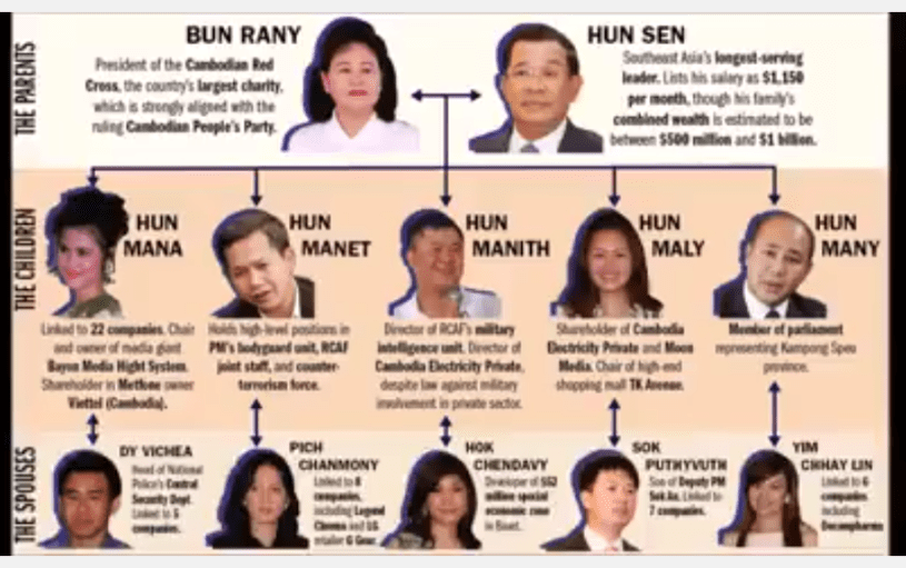 អង្គការឃ្លាំមើលពិភពលោក កន្លងមក ក៏បានវាយតម្លៃផងដែរថា អំពើពុករលួយជាលក្ខណៈប្រព័ន្ធ លំដាប់កំពូលនៅកម្ពុជា កើតឡើងដោយសារតែសំណាញ់អំណាចគ្រួសារ និងបក្សពួកនិយម។ អង្គការនេះ បានរកឃើញអំពី រចនាសម្ព័ន្ធអំណាច ត្រកូល “ហ៊ុន” ដែលចងក្រឡាដូចសំបុកពីងពាងជាមួយគ្រួសាររបស់មន្ត្រីជាន់ខ្ពស់ កំពូលៗក្នុងជួររដ្ឋាភិបាល រួមមាន៖