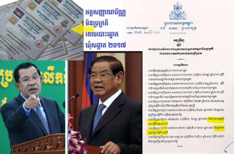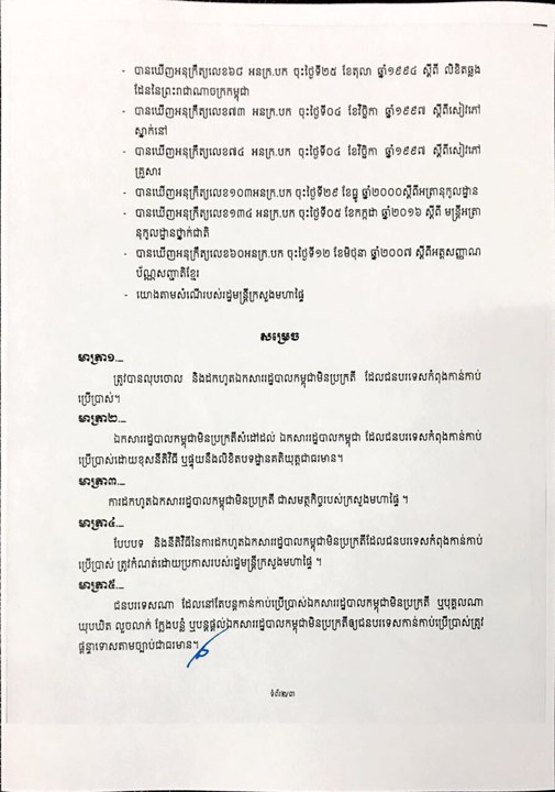 រដ្ឋាភិបាល បានចេញអនុក្រឹត្យ ស្តីពីការលុបចោល និងការដកហូតឯកសាររដ្ឋបាលមិនប្រក្រតី ដែលជនបរទេសកំពុងកាន់កាប់ប្រើប្រាស់ សព្វថ្ងៃ។ អនុក្រឹត្យនេះ ប្រកាសឲ្យប្រើកាលពីថ្ងៃទី ១៥ ខែសីហា ឆ្នាំ២០១៧។ អនុក្រឹត្យនេះ បានដាក់ឲ្យនិរាករណ៍នូវបទប្បញ្ញត្តិ ឯកសារ ឬអនុក្រឹត្យមុនៗ ដែលផ្ទុយពីខ្លឹមសារនេះ។