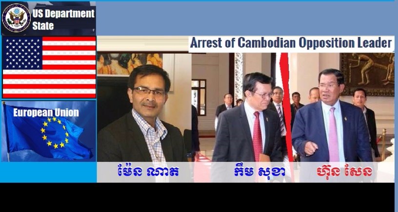 ក្រសួងការបទេសអាមេរិក និងសហភាពអឺរ៉ុប បានប្រតិកម្មជំទាស់នឹងការចាប់ខ្លួន លោក កឹម សុខា ប្រធានគណបក្សសង្គ្រោះជាតិ ពីបទដែលអាជ្ញាធរចោទថា ក្បត់ជាតិ ឬប៉ុនប៉ងផ្តួលរំលំរដ្ឋាភិបាលកម្ពុជារបស់លោកនាយករដ្ឋមន្ត្រី ហ៊ុន សែន ដែលកាន់អំណាចជាង ៣០ ឆ្នាំ។
