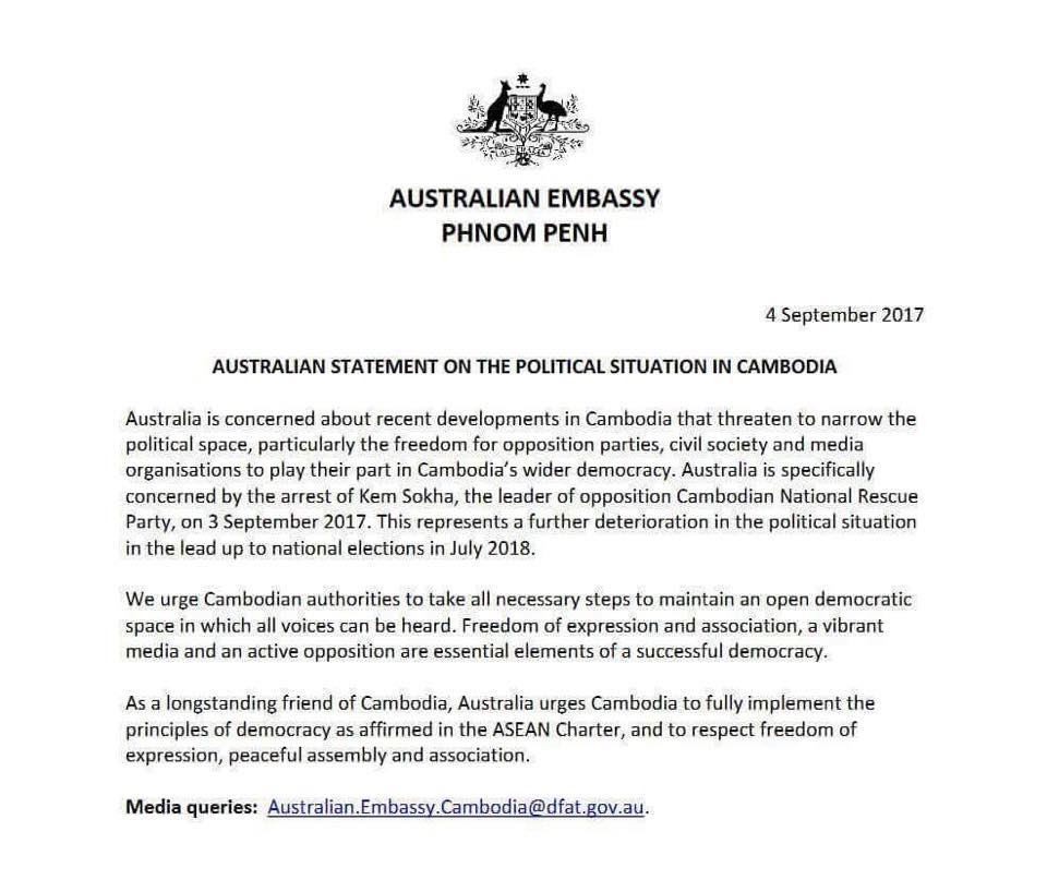 ស្ថានទូតអូស្ត្រាលី ប្រចាំកម្ពុជា បានប្រកាសព័ត៌មាន នាថ្ងៃទី០៤ ខែកញ្ញា ឆ្នាំ២០១៧ ស្តីពីស្ថានភាពនយោបាយកម្ពុជា កំពុងធ្លាក់ក្នុងសភាពធ្ងន់ធ្ងរ បន្ទាប់ពីរដ្ឋាភិបាលរបស់នាយករដ្ឋមន្រ្តី ហ៊ុន សែន ចាត់វិធានការក្តៅ រឹត្បិតសេរីភាពលំហនយោបាយ ជាពិសេស សេរីភាពរបស់គណបក្សប្រឆាំង អង្គការសង្គមស៊ីវិល និងសារព័ត៌មាន ដែលដើរតួនាទីយ៉ាងសំខាន់ នៅលើមាគ៌ាសង្គមប្រជាធិបតេយ្យ នៅកម្ពុជា។