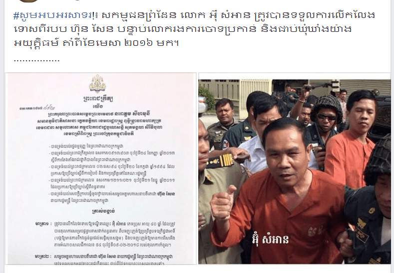 នៅថ្ងៃទី២៥ ខែសីហា ឆ្នាំ២០១៨ សកម្មជនព្រំដែន និងជាតំណាងរាស្រ្តបក្សប្រឆាំង លោក អ៊ុំ សំអាន ត្រូវបានទទួលការលើកលែងទោសឲ្យមានសេរីភាពវិញហើយ ពីរបបលោក ហ៊ុន សែន ។ លោក សំអាន ទទួលរងការចោទប្រកាន់ និងជាប់ឃុំឃាំងយ៉ាងអយុត្តិធម៌ តាំពីថ្ងៃទី១១ ខែមេសា ២០១៦ មក។ ការដោះលែងនេះ បន្ទាប់ពីសម្ពាធធ្ងន់ធ្ងរពីអន្តរជាតិខាងលោកសេរី ជាពិសេសគឺ អាមេរិក និងសហភាពអឺរ៉ុប។