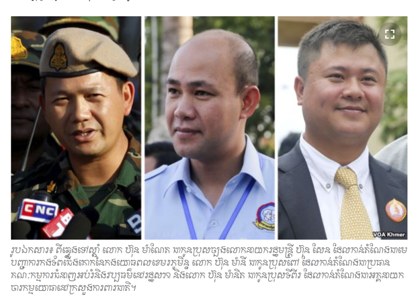 ភ្នំពេញ — នៅក្នុងអ្វីដែលអាចជាការបង្ហាញជាសាធារណៈជាលើកដំបូង លោកនាយករដ្ឋមន្ត្រី ហ៊ុន សែន បានថ្លែងប្រាប់កាសែតជប៉ុន នៅក្នុងសប្ដាហ៍កន្លងទៅថា កូនប្រុសច្បងរបស់លោក គឺលោកឧត្ដមសេនីយ៍ឯក ហ៊ុន ម៉ាណែត មានលទ្ធភាពក្លាយជាមេដឹកនាំប្រទេស ទៅថ្ងៃអនាគត។