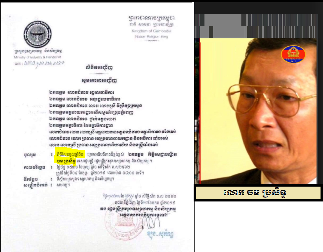 ក្នុងលិខិតអញ្ជើញមួយ ចុះថ្ងៃទី ៣០ ខែមករា ដែលធ្វើឡើងដោយលោក ឡុង សុភ័ណ្ឌ អគ្គនាយករងកិច្ចការទូទៅ នៃក្រសួងឧស្សាហកម្ម និងសិប្បកម្ម ហើយដែលបានបែកធ្លាយជាសាធារណៈ លើបណ្តាញសង្គមហ្វេសប៊ុកនោះ «បានណែនាំដល់មន្ត្រីក្រសួងទាំងអស់ ត្រូវស្លៀកពាក់ឲ្យបានសមរម្យ ចូលរួមពិធីសែនចូលឆ្នាំចិន នៅទីស្តីការក្រសួង នាថ្ងៃទី ៤ ខែកុម្ភៈ ក្រោមអធិបតីភាពលោក ចម ប្រសិទ្ធ រដ្ឋមន្រ្តីក្រសួងឧស្សាហកម្ម និងសប្បកម្ម»។