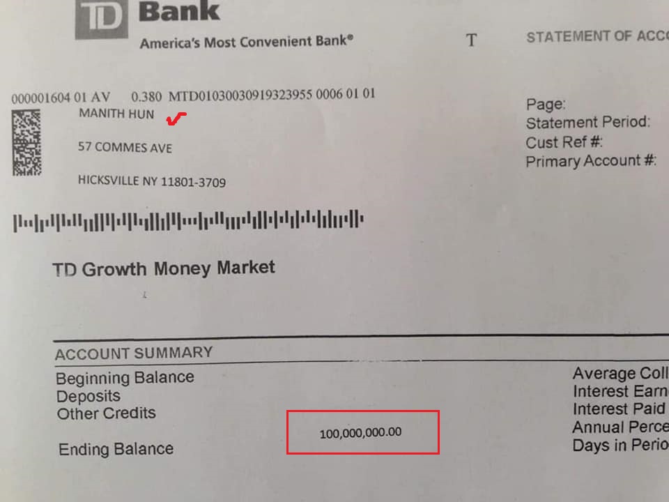 ឯកសារធនាគារមួយ ត្រូវបានចែកចាយទូលំទូលាយនៅលើបណ្តាញសង្គម បង្ហាញថាលោក ហ៊ុន ម៉ានិត មេដឹកនាំផ្នែកចារកិច្ចរបស់របប ហ៊ុន សែន និងជាកូនប្រុសលោក ហ៊ុន សែន ផងនោះ បានផ្ញើលុយនៅធនាគារអន្តរជាតិ ១០០ លានដុល្លារអាមេរិក។
