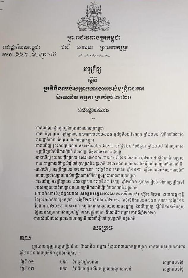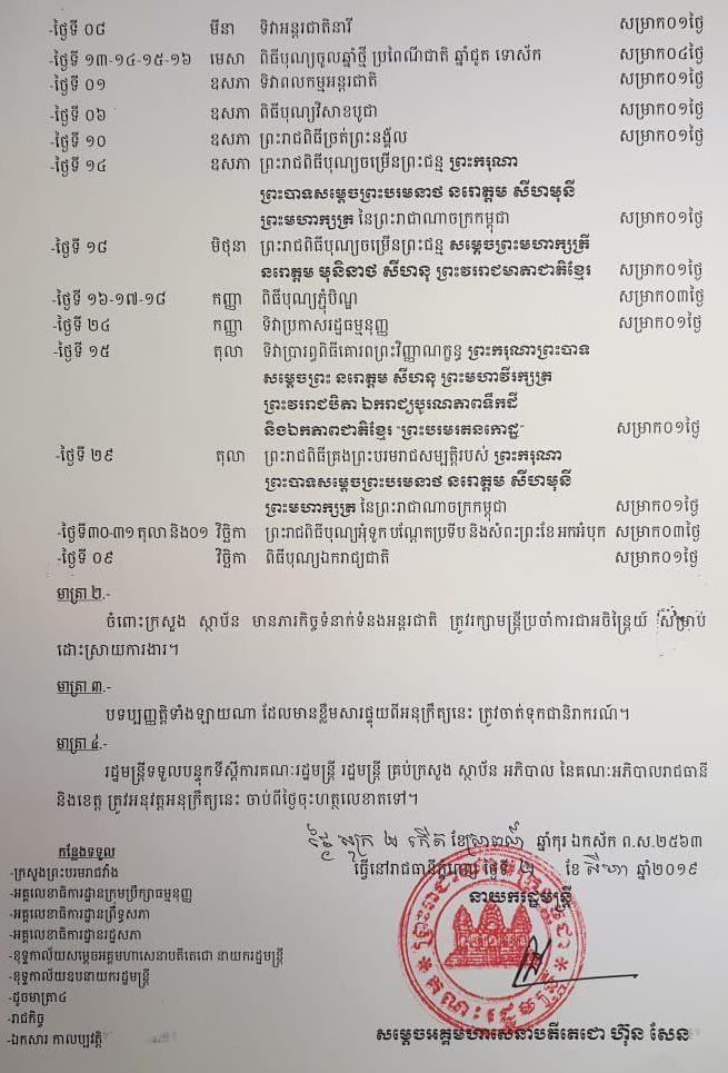 របបដឹកនាំរបស់លោក ហ៊ុន សែន សម្រេចដាក់ចេញនូវប្រតិទិនឈប់សម្រាកប្រចាំឆ្នាំជាថ្មី ដោយដកចេញនូវទិវាឈប់សម្រាកដ៏សំខាន់ៗ ២ ដែលមានខ្លឹមសារជាប្រវិត្តសាស្ត្រ ទាក់ទងការផ្សះផ្សាជាតិ និងការនាំចូលលទ្ធិប្រជាធិបតេយ្យនៅកម្ពុជា។ នេះបើតាមអនុក្រឹត្យ ដែលចុះហត្ថលេខាដោយនាយករដ្ឋមន្រ្តី {មិនស្របច្បាប់?} លោក ហ៊ុន សែន កាលពីថ្ងៃទី០២ ខែសីហា ឆ្នាំ២០១៩។
