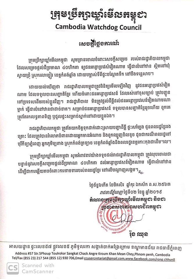 ក្រុមប្រឹក្សាឃ្លាំមើលកម្ពុជា សូមអំពាវនាវយ៉ាងទទូចដល់រាជរដ្ឋាភិបាលកម្ពុជា ត្រូវលុបចោលជាបន្ទាន់ នូវសេចក្តីសម្រេចផ្តល់ដីប្រមាណ ៤០ ហិកតា ដល់អន្តោប្រវេសន៍វៀតណាម ធ្វើជាលំនៅឋាន ដើម្បីជាការឆ្លើយតបការទាមទាររបស់ពលរដ្ឋខ្មែរ នៅលើបណ្តាញសង្គម។
