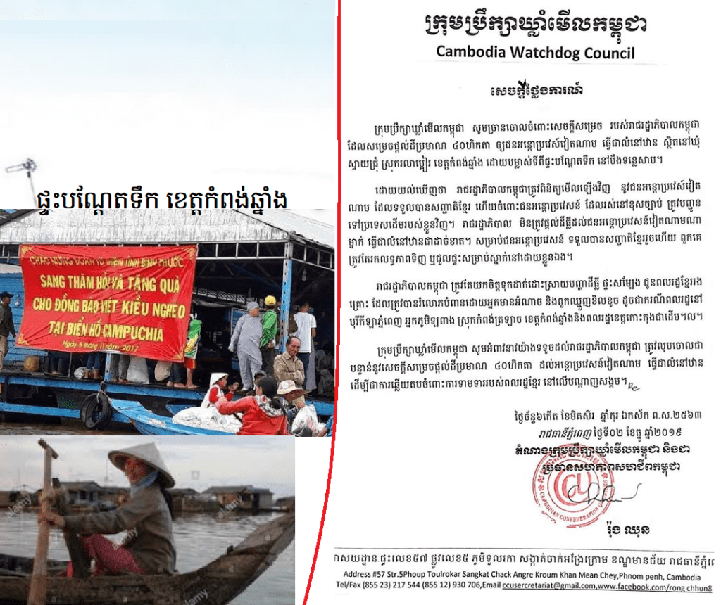 ក្រុមប្រឹក្សាឃ្លាំមើលកម្ពុជា សូមច្រានចោលចំពោះសេចក្តីសម្រេចរបស់រាជរដ្ឋាភិបាលកម្ពុជា ដែលសម្រេចផ្តល់ដីប្រមាណ ៤០ ហិកតា ឲ្យជនអន្តោប្រវេស៍វៀតណាម ធ្វើជាលំនៅឋាន ស្ថិតនៅឃុំស្វាយជ្រុំ ស្រុករលាប្អៀរ ខេត្តកំពង់ឆ្នាំង ដោយបម្លាស់ទីពីផ្ទះបណ្តែតទឹក នៅបឹងទន្លេសាប។