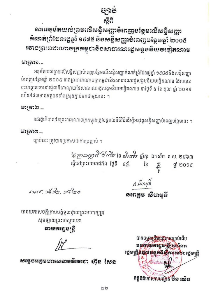 ព្រះមហាក្សត្រ នរោត្តម សីហមុន្នី កាលពីថ្ងៃទី ៥ ខែធ្នូ ឆ្នាំ២០១៩ បានឡាយព្រះហស្ថលេខា ប្រកាសឲ្យប្រើ សន្ធិសញ្ញាព្រំដែនបំពេញបន្ថែមថ្មី មាន ២ ទំព័រ ដែលមានឈ្មោះថ្មីថា «សន្ធិសញ្ញាព្រំដែនបំពេញបន្ថែម ២០១៩» រវាងកម្ពុជា និង វៀតណាម។ សន្ធិសញ្ញាថ្មីនេះ ជាសន្ធិសញ្ញាដែលសរសេរបន្ថែមខ្លឹមសារទៅលើ «សន្ធិសញ្ញាកំណត់ព្រំដែនរដ្ឋ ឆ្នាំ ១៩៨៥ និង សន្ធិសញ្ញាបំពេញបន្ថែម ឆ្នាំ ២០០៥ រវាងកម្ពុជា-វៀតណាម»។