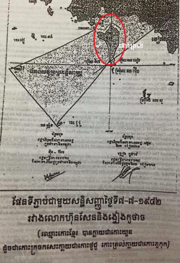 ហេតុនេះ ខ្ញុំសម្រេចថា កោះទំាងឡាយណា ដែលនៅខាងជើងខ្សែ បន្ទាត់មួយ ដែលកាត់កែង នឹងឆ្នេរសមុទ្រ គិតពីចំណុចព្រំប្រទល់ រវាងប្រទេសកម្ពុជា និង កូសំាងស៊ីន ហើយដែលមានមុំ ១៤០ អង្សារ ជាមួយនឹងភាគខាងជើង នៃខ្សែវណ្ឌ ដូចមានក្នុងផែនទី ដែល មានភ្ជាប់មកជាមួយនេះ ចាប់ពីថ្ងៃនេះតទៅ នឹងត្រូវគ្រប់គ្រង ដោយប្រទេសកម្ពុជា។