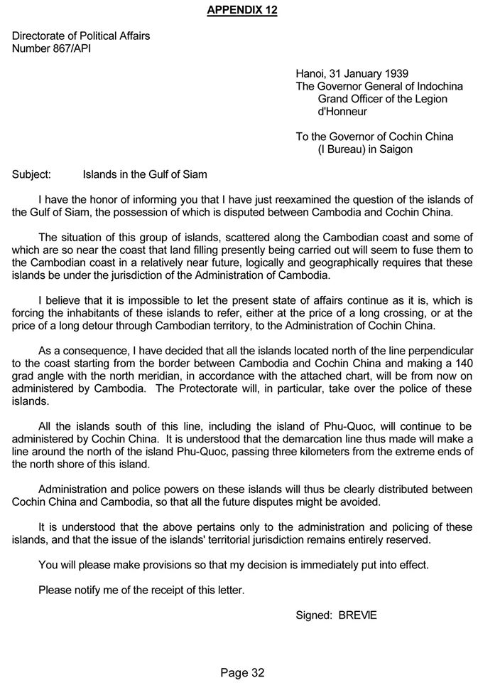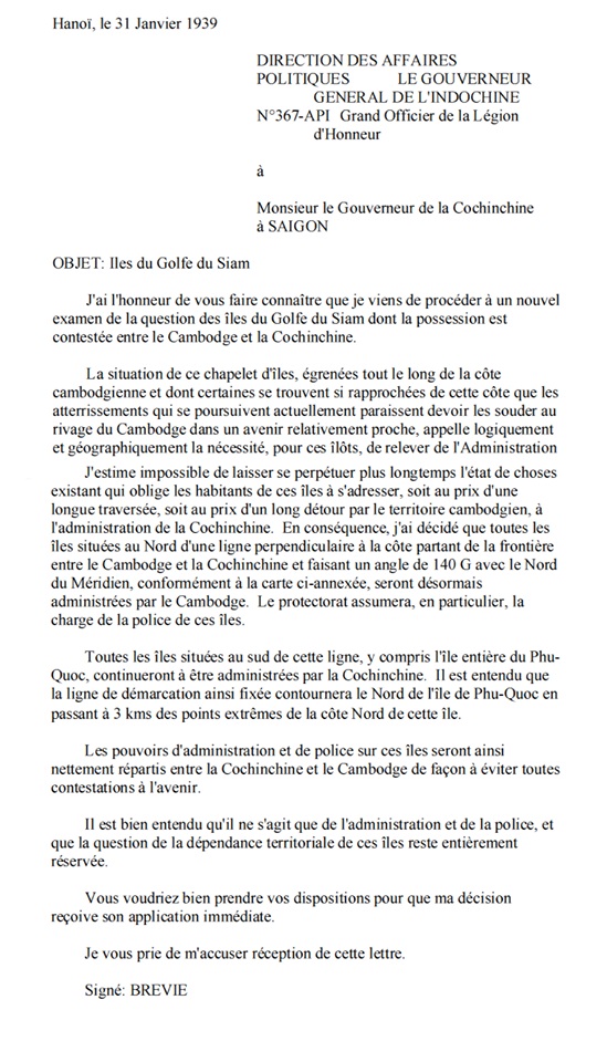If I am not allowed to continue much longer the state of affairs requires that the inhabitants of these islands to address, or the price of a long voyage, is the price of a long detour through the territory of Cambodia, the administration of Cochinchina. Accordingly, I have decided that all the islands north of a line perpendicular to the coast from the border between Cambodia and Cochinchina and forming an angle with 140’c northern Meridien, according to the map attached, will be administered by Cambodia. The protectorate assume, in particular, the burden of policing of these islands.