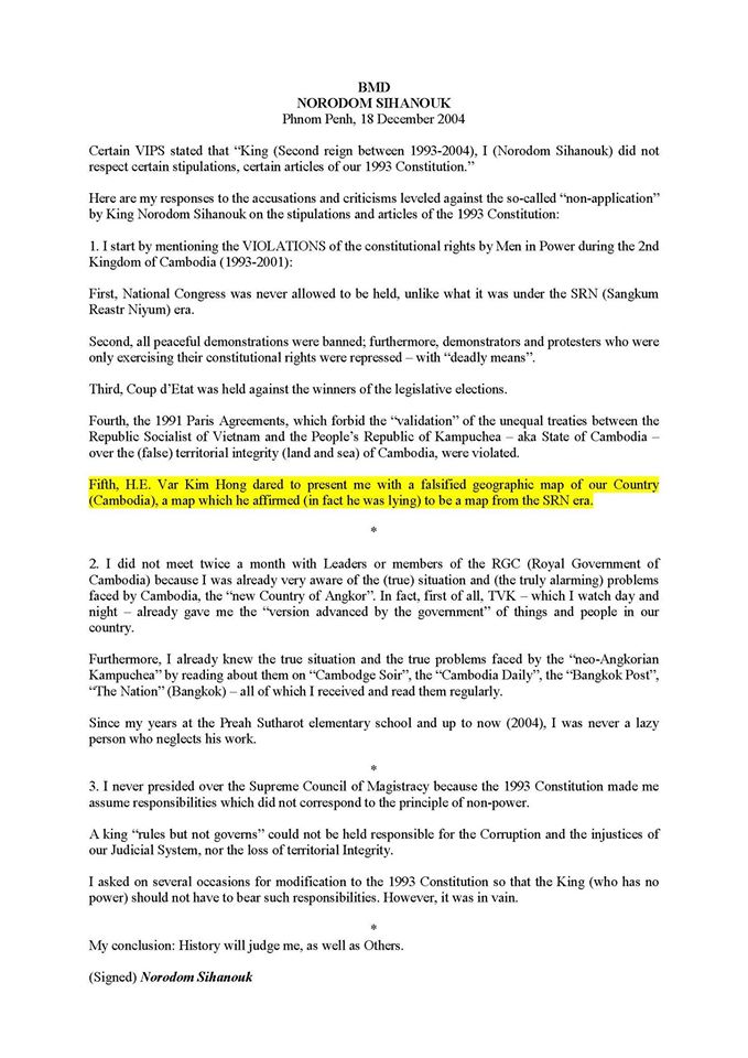 ក្នុងព្រះរាជសាររបស់សម្តេច នរោត្តម សីហនុ ថ្ងៃទី ១៨ ធ្នូ ឆ្នាំ២០០៤ មានពីរទំព័រ ត្រូវបានផ្សព្វផ្សាយជាភាសាបារាំង ខណៈពេលការចរចារឿងព្រំដែន រវាងកម្ពុជា និងវៀតណាម ស្ថិតក្នុងសភាពតានតឹង និងមានចម្រូងចម្រាសផង។ ក្នុងព្រះរាជសារនេះ បានគូសបញ្ជាក់សំដៅ «បុរសមានអំណាច គឺលោក ហ៊ុន សែន បានរំលោភរដ្ឋធម្មនុញ្ញ តាំងពីឆ្នាំ ១៩៩៣ មក»។ ព្រះអង្គ មានព្រះបន្ទូលថា កិច្ចព្រមព្រៀងទីក្រុងប៉ារីស ឆ្នាំ១៩៩១ ដែលបានហាមប្រាម «ការផ្តល់សុពលភាព» នូវ «សន្ធិសញ្ញាមិនស្មើភាពទាំងឡាយ» រវាងកម្ពុជា និងវៀតណាម ធ្វើឡើងនៅមុនទសវត្សរ៍ទី៩០ ទៅលើទឹកដី (ព្រំដែនគោក និង សមុទ្រ) របស់កម្ពុជា ត្រូវបានរំលោភបំពាន។