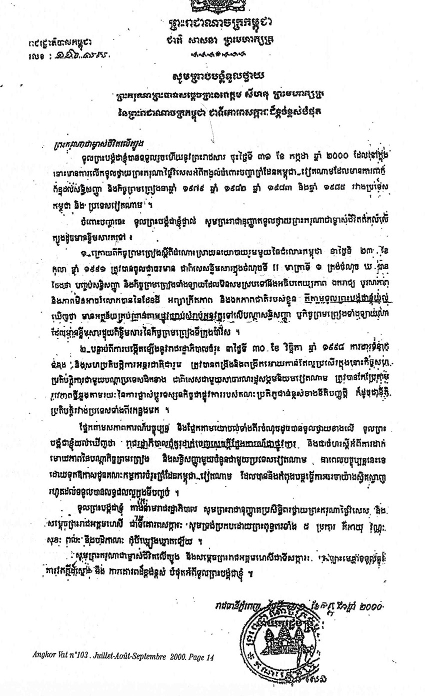 - លិខិតលោក ហ៊ុន សែន ទូលថ្វាយព្រះមហាក្សត្រ នរោត្តម សីហនុ ថ្ងៃទី ៣១ កក្កដា ឆ្នាំ ២០០០ (សូមទាញយក Download)