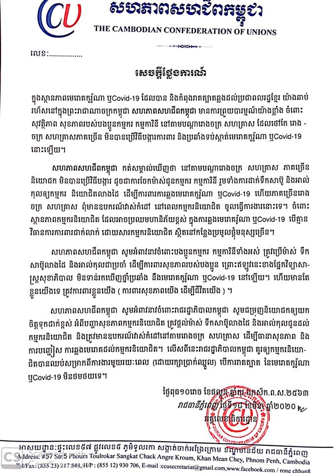 សហភាពសហជីពកម្ពុជា នៅថ្ងៃទី ១៨ ខែមីនា នេះដែរ បានចេញសេចក្តីថ្លែងការណ៍ សម្តែងការព្រួយបារម្ភ ចំពោះកម្មករកម្មការិនី ដែលកំពុងធ្វើការងារជាក្រុម នៅក្នុងរោងចក្រនានា នៅទូទាំងប្រទេសកម្ពុជា គឺជាហានីភ័យខ្ពស់ អាចងាយឆ្លងមេរោគកូរ៉ូណា (Covid-19)។ លោក រ៉ុង ឈុន ប្រធានសហភាពសហជីពនេះ បានឲ្យដឹងនៅក្នុងសេចក្តីថ្លែងការណ៍ថា «ស្នើសុំឲ្យភាគីនិយោជក (ថៅកែ) ត្រូវយកចិត្តទុកដាក់ចំពោះកម្មករ ដោយតម្រូវឲ្យពួកគេ ពាក់ម៉ាស់ និងមានទឹកសាប៊ូ ឬអាល់កុល លាងសម្អាតដៃ មុនពេលចូលធ្វើការ និងក្រោយម៉ោងការងារ»។ លោក បានបន្ថែមក្នុងសេចក្តីថ្លែងការណ៍ថា «រាជរដ្ឋាភិបាលកម្ពុជា សូមជួយដាក់សម្ពាធដល់ក្រុមថៅកែរោងចក្រទាំងអស់ ឲ្យជួយដោះស្រាយបញ្ហាកម្មករ ក្នុងរឿងនេះឲ្យបានឆាប់រហ័ស»។