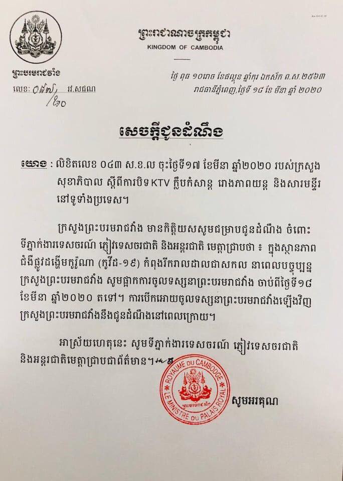 បន្ទាប់ពីក្រសួងសុខាភិបាលកម្ពុជា ស្នើទៅនាយករដ្ឋមន្ត្រី កាលពីថ្ងៃទី ១៧ មីនា ២០២០ «ផ្អាកជាបណ្តោះអាសន្ន នូវការជួបជុំនានា និងពិធីបុណ្យសាសនា» នោះក្លឹបកំសាន្ត, ខេធីវី (KTV), រោងភាពយន្ត, មណ្ឌលកំសាន្ត និង សារមន្ទីរ នៅទូទាំងប្រទេស ត្រូវបានប្រកាសឲ្យផ្អាកដំណើរការមួយរយៈ ដើម្បីចូលរួមទប់ស្លាត់ការរីករាលដាលមេរោគកូរ៉ូណា (Covid-19) នៅកម្ពុជា។