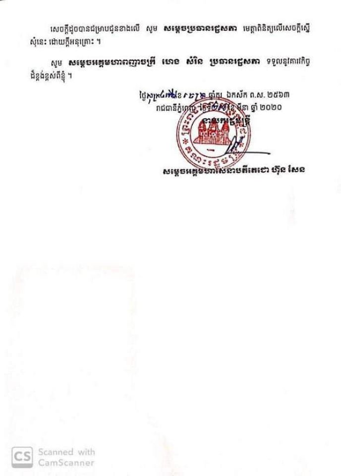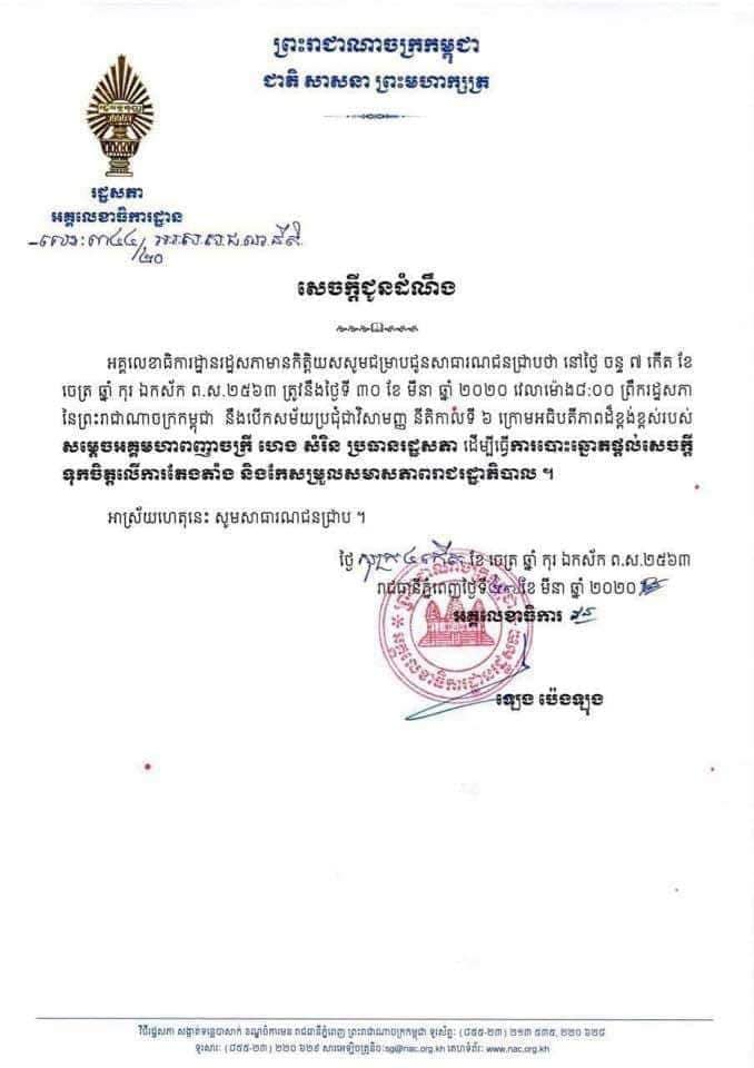 លោក ឡេង ប៉េងឡុង អ្នកនាំពាក្យរដ្ឋសភា ប្រកាសភ្លាមៗនៅថ្ងៃទី ២៧ មីនាដដែលថា រដ្ឋសភា នឹងកោះប្រជុំវិសាមញ្ញ នៅថ្ងៃទី ៣០ ខែ មីនា ដើម្បីអនុម័តតាមការស្នើសុំរបស់លោក ហ៊ុន សែន។