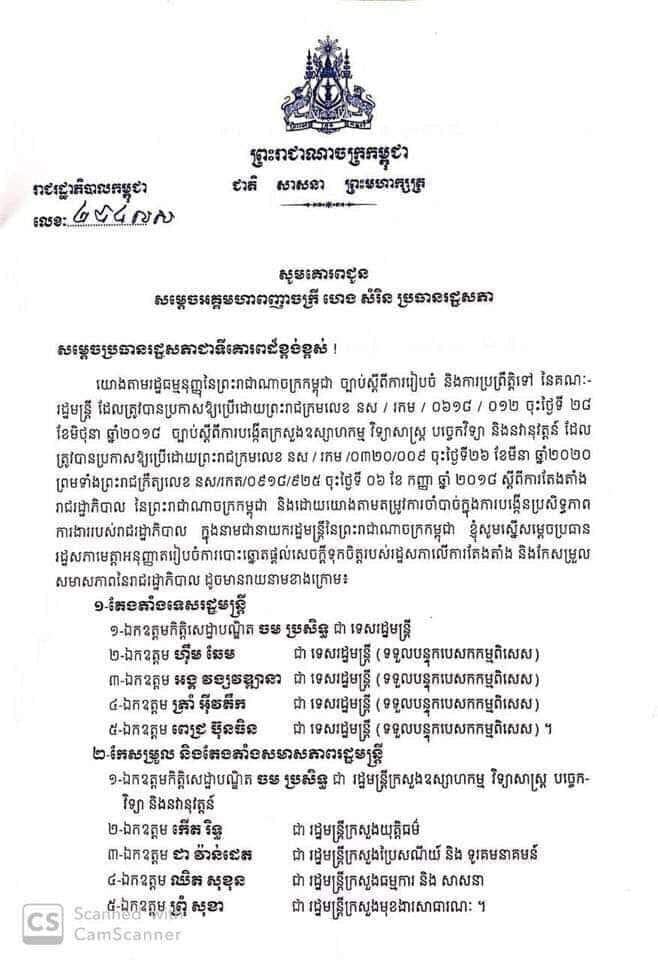 លោក ហ៊ុន សែន មេដឹកនាំរដ្ឋាភិបាលទីក្រុងភ្នំពេញ នៅថ្ងៃទី ២៧ ខែមីនា ឆ្នាំ ២០២០ បានស្នើទៅរដ្ឋសភាជាតិ របស់លោក ហេង សំរិន ដើម្បីអនុម័តយល់ព្រមផ្លាស់ប្តូរសមាសភាពរដ្ឋមន្រ្តី ៤ រូប នៃក្រសួងយុត្តិធម៌ ក្រសួងប្រៃសណីយ៍ ក្រសួងធម្មការ និងក្រសួងមុខងារសាធារណៈ។ លោក ព្រុំ សុខា រដ្ឋលេខាធិការក្រសួងមហាផ្ទៃ នឹងទៅកាន់តំណែង រដ្ឋមន្រ្តីក្រសួងមុខងារសាធារណៈ។ លោក កើត រិទ្ធ នឹងកាន់តំណែងជា រដ្ឋមន្រ្តីក្រសួងយុតិ្តធម៌។ លោក ឈិត សុខុន នឹងកាន់តំណែង រដ្ឋមន្រ្តីក្រសួងធម្មការ និងសាសនា។ លោក ជា វ៉ាន់ដេត នឹងកាន់តំណែង រដ្ឋមន្រ្តីក្រសួងប្រៃសណីយ៍ និងទូរគមនាគមន៍។