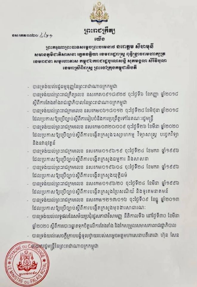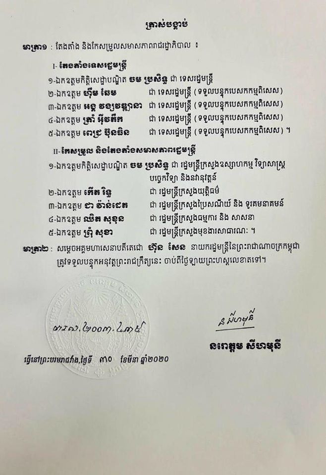 ក្រោយរដ្ឋសភាជាតិរបស់លោក ហេង សំរិន អនុម័តយល់ព្រមជាឯកឆន្ទ ទៅលើសមាសភាពសមាជិកមួយចំនួន នៃគណៈរដ្ឋមន្ត្រី ព្រឹកថ្ងៃទី ៣០ ខែមីនា ឆ្នាំ ២០២០ ភ្លាមៗនោះព្រះមហាក្សត្រ នរោត្តម សីហមុនី បានត្រាស់បង្គាប់តែងតាំងមន្រ្តីជាន់ខ្ពស់ទាំងនះ ជារដ្ឋមន្ត្រី និង ទេសរដ្ឋមន្ត្រីអមនាយករដ្ឋមន្រ្តី (ចុចត្រង់នេះ មានភ្ជាប់ព្រះរាជក្រឹត្យ) តាមការស្នើសុំរបស់លោក ហ៊ុន សែន។ ការស្នើសុំ បានធ្វើឡើងកាលពីថ្ងៃទី ២៧ ខែមីនា។