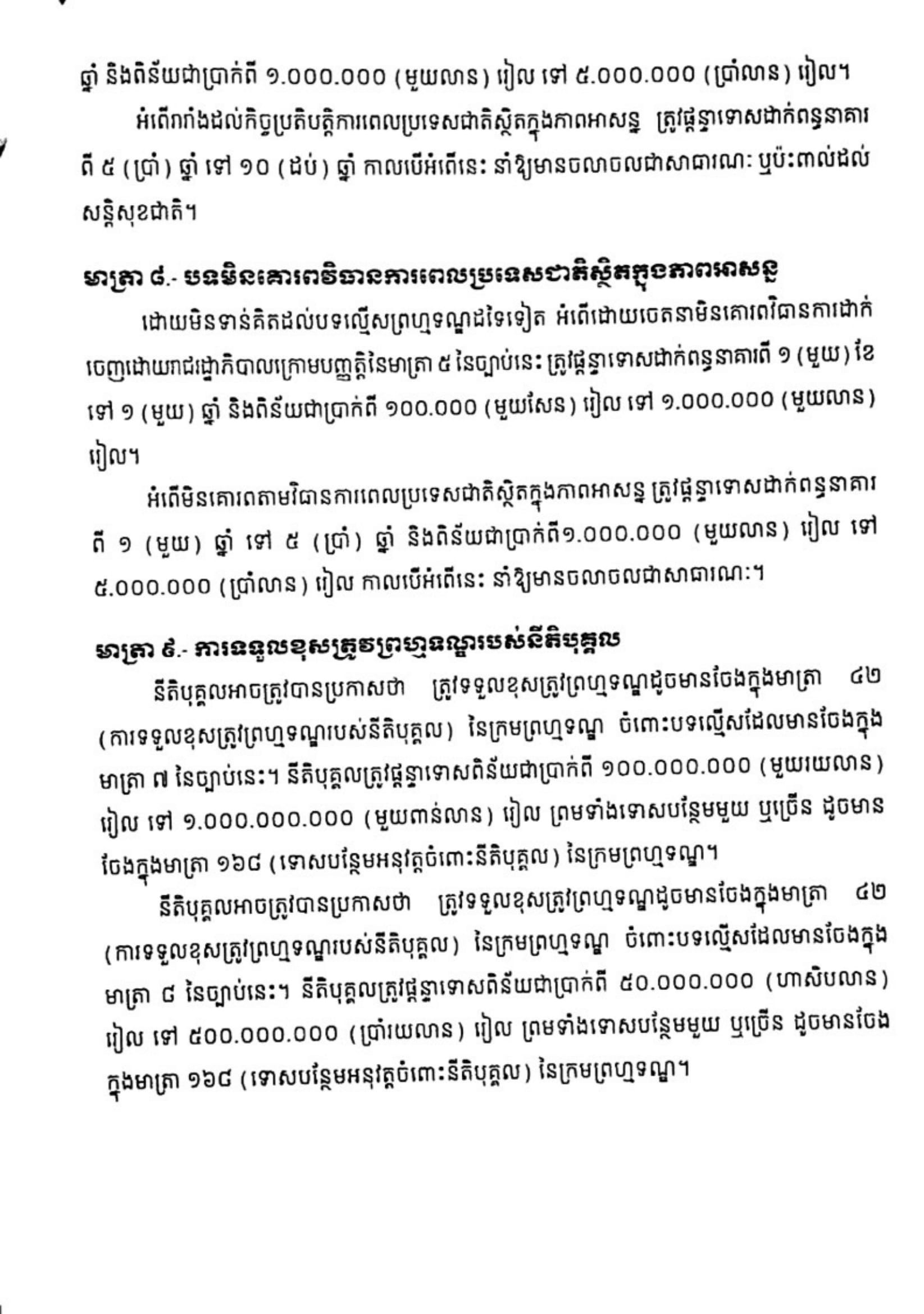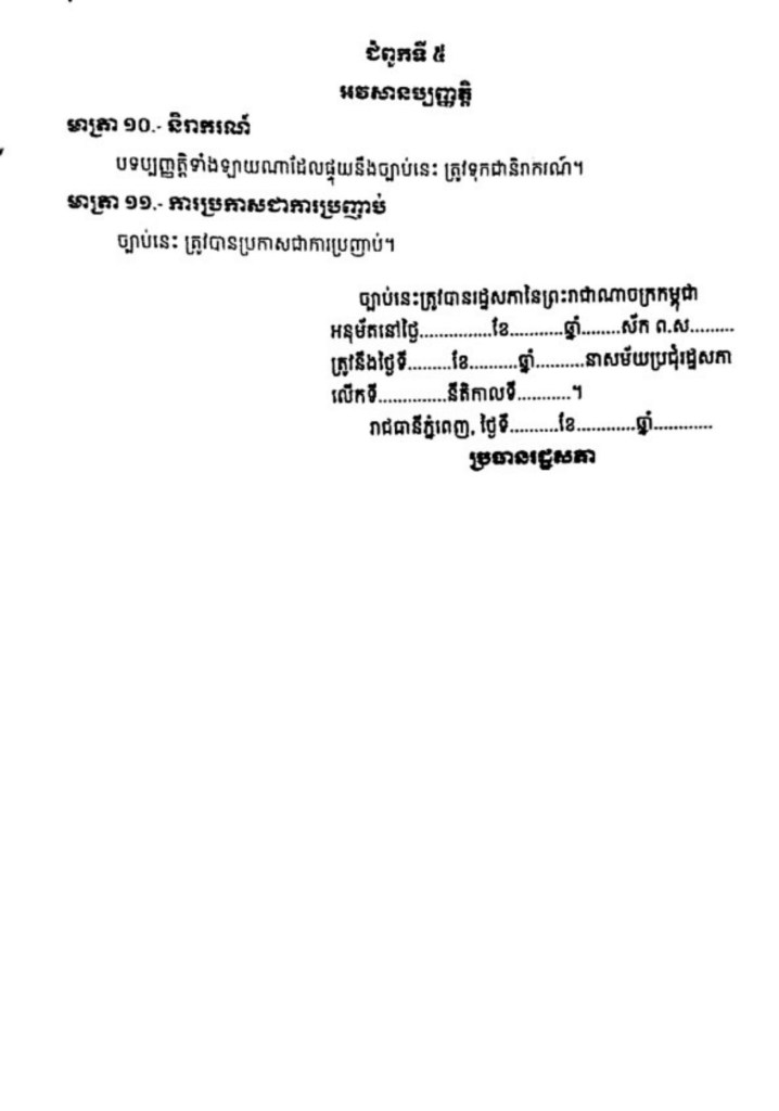 ពង្រាងច្បាប់នេះ ត្រូវបញ្ជូនទៅកាន់រដ្ឋសភាជាតិ របស់លោក ហេង សំរិន ជាការប្រញាប់ ដើម្បីពិនិត្យ ពិភាក្សា និងអនុម័ត។ ជាទូទៅ រាល់ការអនុម័តច្បាប់ នាពេលកន្លងទៅ ភាគច្រើន មិនសូវមានការជជែកដេញដោល បន្ថែម ឬបន្ថយខ្លឹមសារ ឬមួយក៏កែពាក្យខុស ឬពាក្យត្រូវអ្វីនោះទេ ពោលគឺ សមាជិកសភា ត្រូវនាំគ្នាលើកដៃ អនុម័តជាឯកឆន្ទតែម្តង ទៅលើខ្លឹមសារដើមទាំងស្រុង។