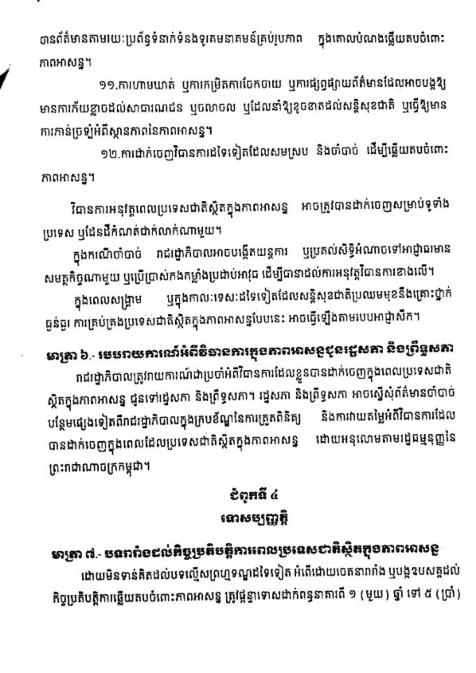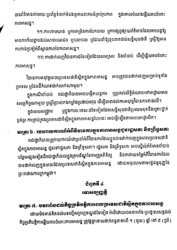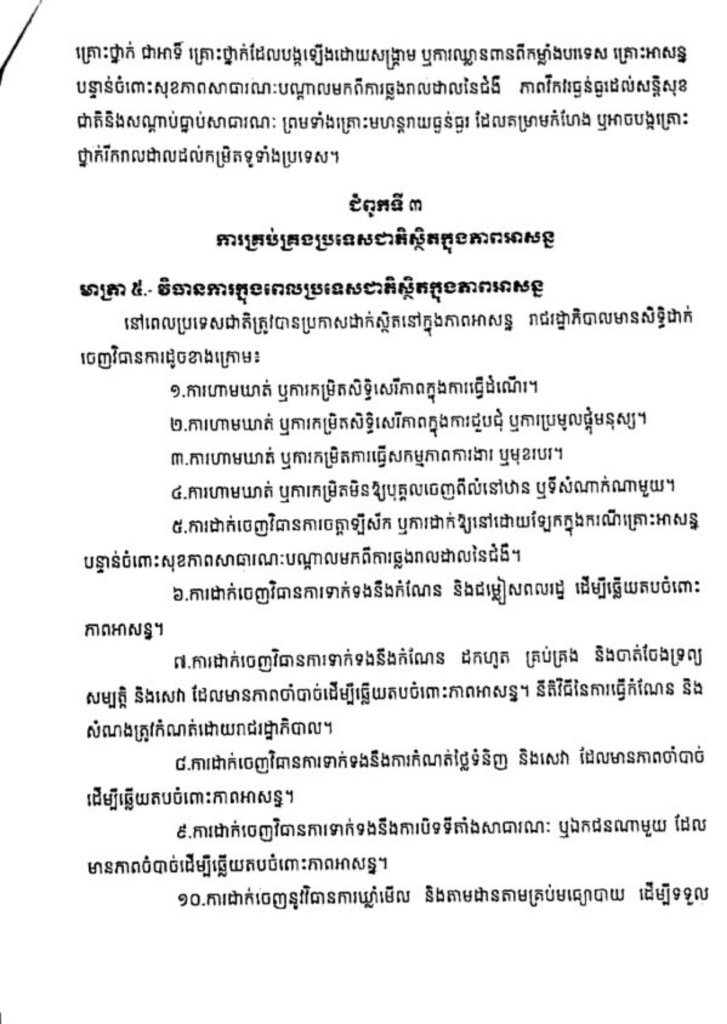សេចក្តីព្រាងច្បាប់ ស្តីពីការគ្រប់គ្រងប្រទេសជាតិក្នុងភាពអាសន្ន បានឆ្លងផុតពីគណៈរដ្ឋមន្ត្រីហើយ ក្រោមការដឹកនាំកិច្ចប្រជុំបន្ទាន់ ដោយលោក ហ៊ុន សែន កាលពីថ្ងៃទី ៣១ ខែមីនា ឆ្នាំ ២០២០ ហើយឯកសារនៃ សេចក្តីព្រាងច្បាប់នេះ ត្រូវបានផ្សព្វផ្សាយលើបណ្តាញសង្គម និងបណ្តាញសារព័ត៌មាន នៅថ្ងៃទី ០១ ខែមេសា។ សូមចុចត្រង់នេះ ដើម្បីអាន ឬទាញយកនូវ «សេចក្តីព្រាងច្បាប់ទាំងស្រុង – Download»។