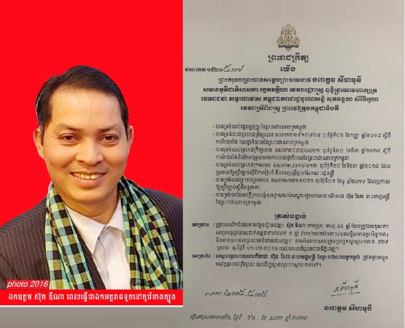 លុះដល់ថ្ងៃទី ០៤ មេសា ២០១៦ លោក ស៊ុត ឌីណា ត្រូវបានដកហូតតូនាទីពីឯកអគ្គរាជទូតនេះ រួចត្រូវបានចាប់ខ្លួនដាក់ពន្ធនាគារព្រៃ.ស នៅទីក្រុងភ្នំពេញ ដូចបានបញ្ជាក់ជូនខាងលើរួចហើយ។