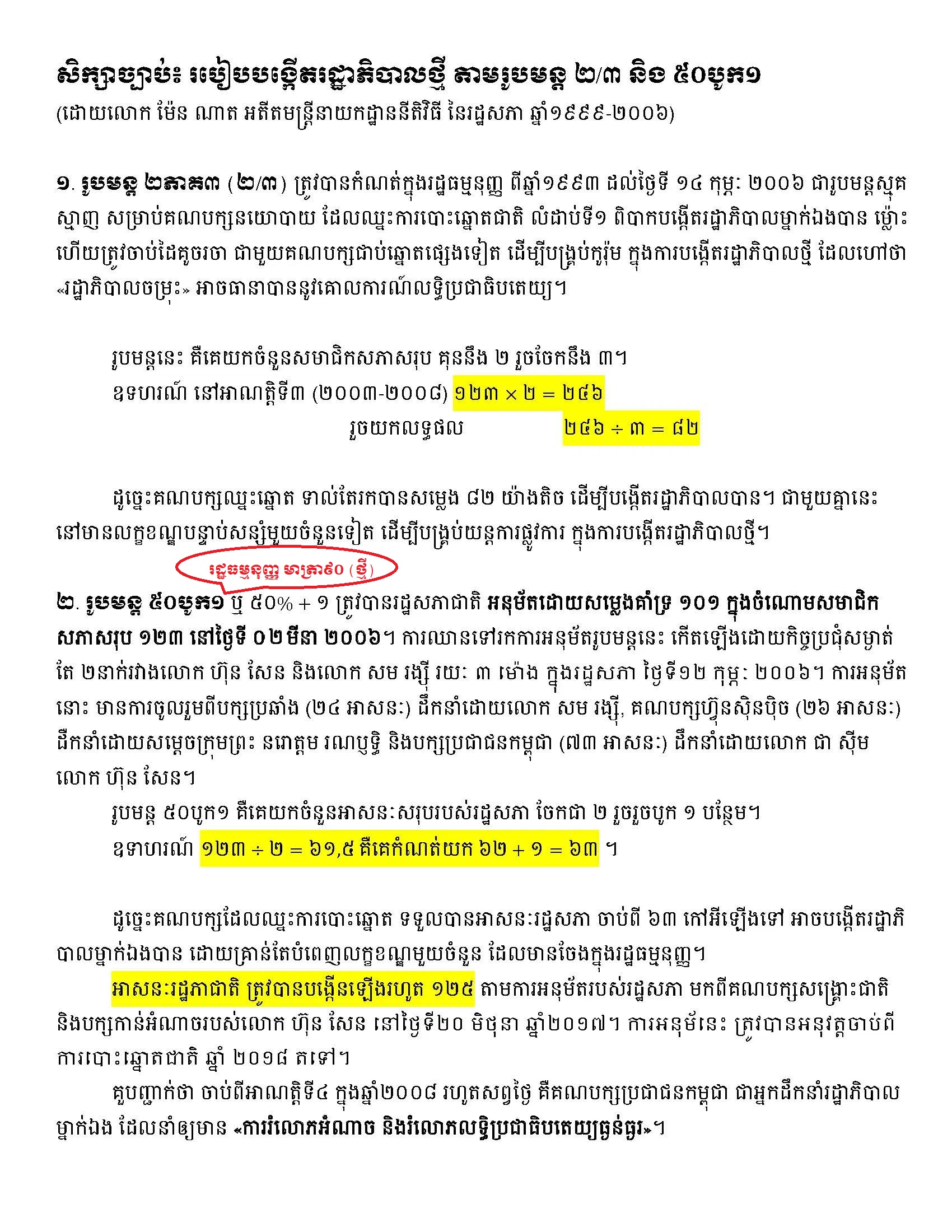 នៅក្នុងសារវីដេអូខ្លីមួយ ធ្វើឡើងនៅខែវិច្ឆិកា ឆ្នាំ២០១៥ ហើយបានផ្សាយឡើងវិញលើបណ្តាញសង្គម នៅថ្ងៃទី ២១ ឧសភា ២០២០ នេះ លោក ម៉ែន ណាត ប្រធានក្រុមប្រឹក្សាឃ្លាំមើលកម្ពុជា បានរំលឹកអំពីមូលហេតុ ២ ចំណុច ដែលនាំឲ្យលោក សម រង្ស៊ី ចូលរួមជាមួយលោក ហ៊ុន សែន ក្នុងការកែប្រែរដ្ឋធម្មនុញ្ញ ពី ២ភាគ៣ (២/៣) មក ៥០%+១ នៅដើមឆ្នាំ ២០០៦ ដែលកាលនោះ លោក សម រង្ស៊ី នៅជាប្រធានគណបក្សសម-រង្ស៊ី មានអាសនៈ ២៤ ក្នុងចំណោមអាសនៈសរុប ១២៣ ក្នុងរដ្ឋសភាជាតិ ជាបក្សប្រឆាំង (អាណត្តិទី៣ ឆ្នាំ២០០៣-២០០៨)។ ចំណែក បក្សហ្វ៊ុនស៊ិនប៉ិច របស់សម្តេចក្រុមព្រះ នរោត្តម រណប្ញទ្ធិ មានអាសនៈ ២៦ ក្នុងរដ្ឋសភា បានចូលរួមធ្វើរដ្ឋាភិបាលចម្រុះ ជាមួយបក្សប្រជាជនកម្ពុជា របស់លោក ហ៊ុន សែន ដែលមាន ៧៣ អាសនៈ។