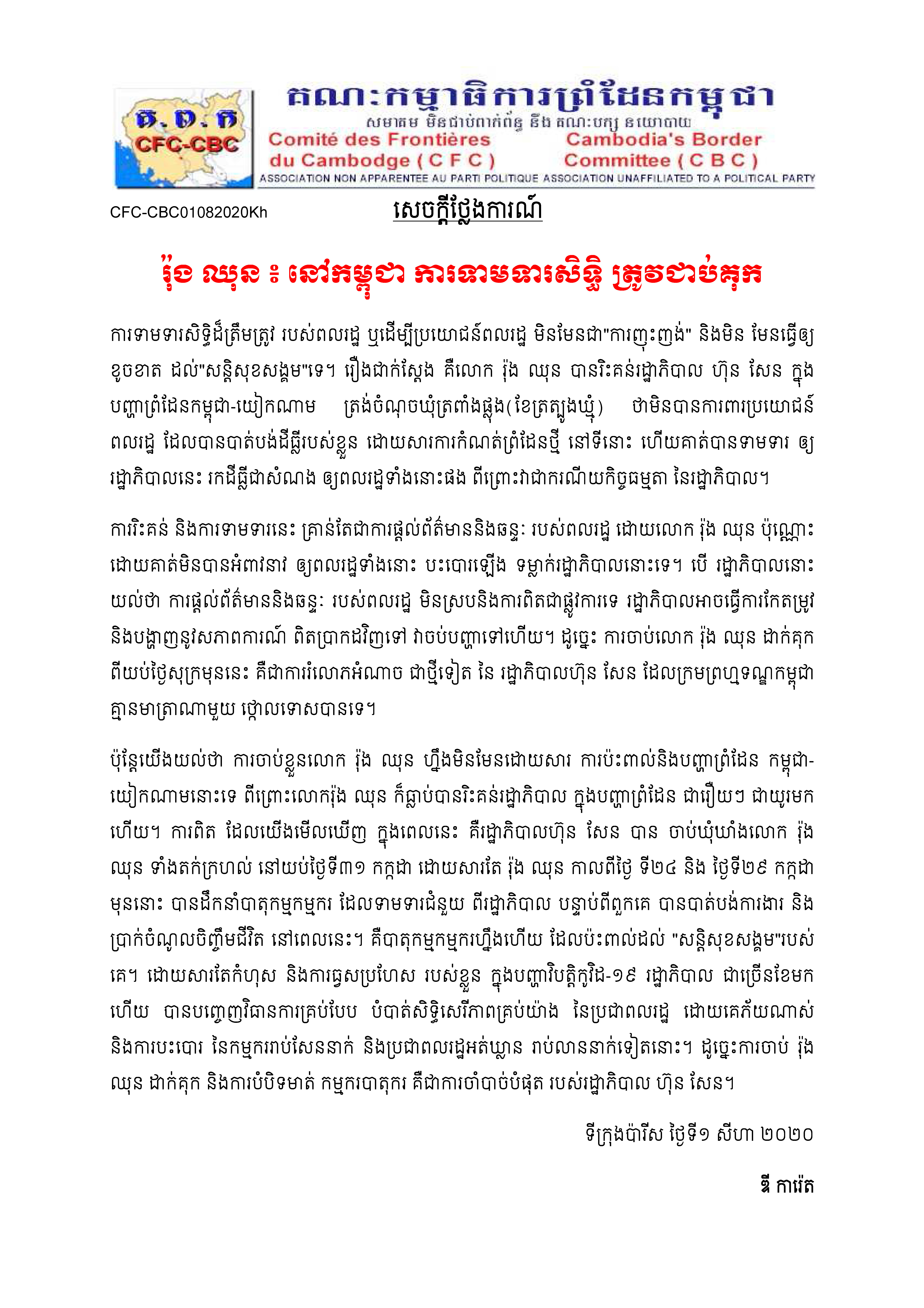 លោកបណ្ឌិត ឌី ការ៉េត ប្រធានគណៈកម្មាធិការព្រំដែនកម្ពុជា នៅប្រទេសបារាំង កាលពីថ្ងៃទី ០១ ខែសីហា ឆ្នាំ២០២០ បានហៅការចាប់ខ្លួនលោក រ៉ុង ឈុន តំណាងក្រុមប្រឹក្សាឃ្លាំមើលកម្ពុជា និងជាប្រធានសហភាពកម្ពុជា គឺក្នុងចេតនាបង្ក្រាបការតវ៉ារបស់ក្រុមសហជីព និងក្រុមកម្មករ នៅពេលក្រុមកម្មករបាត់បង់ការងារ ដែលកើតមានឡើងក្នុងស្ថានភាពវិបត្តិសង្គមកម្ពុជាសព្វថ្ងៃ។