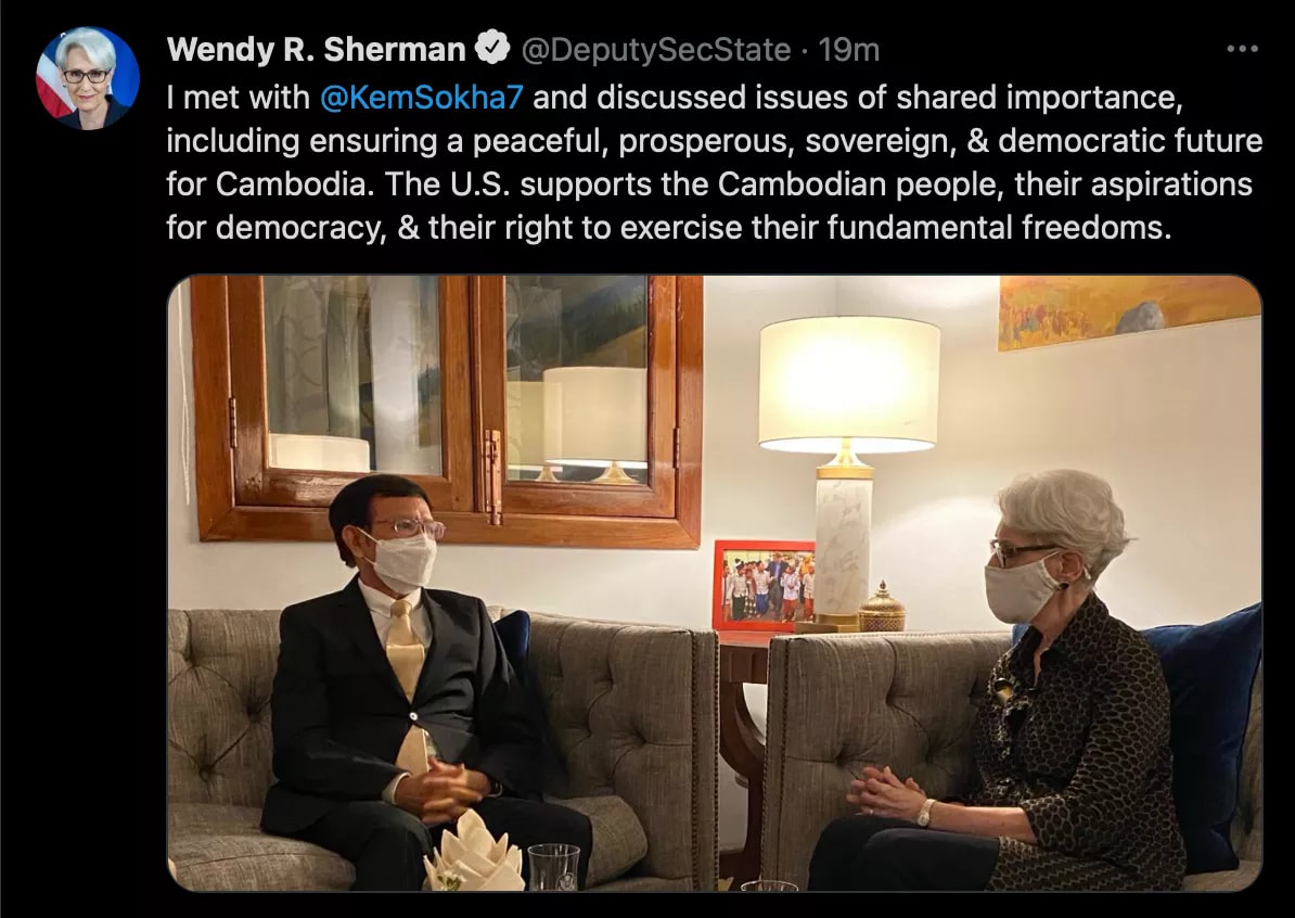 ឧបការីក្រសួងការបរទេសសហរដ្ឋអាមេរិក Wendy Sherman បង្ហាញជំហររឹងមាំ មិនបោះបង់ប្រជាពលរដ្ឋខ្មែរ