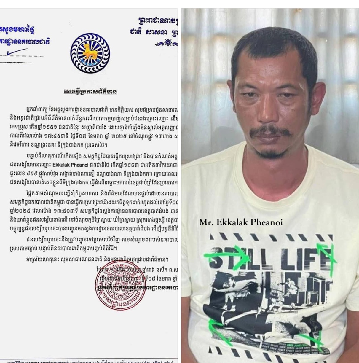 ក្រសួងមហាផ្ទៃ បញ្ជាក់ថា ជនសង្ស័យរូបនេះ នឹងត្រូវបញ្ជូនខ្លួនទៅប្រទេសថៃ វិញតាមសំណូមពររបស់នគរបាលថៃ បន្ទាប់ពីនគរបាលជាតិកម្ពុជា បញ្ចប់នីតិវិធីរួចរាល់។