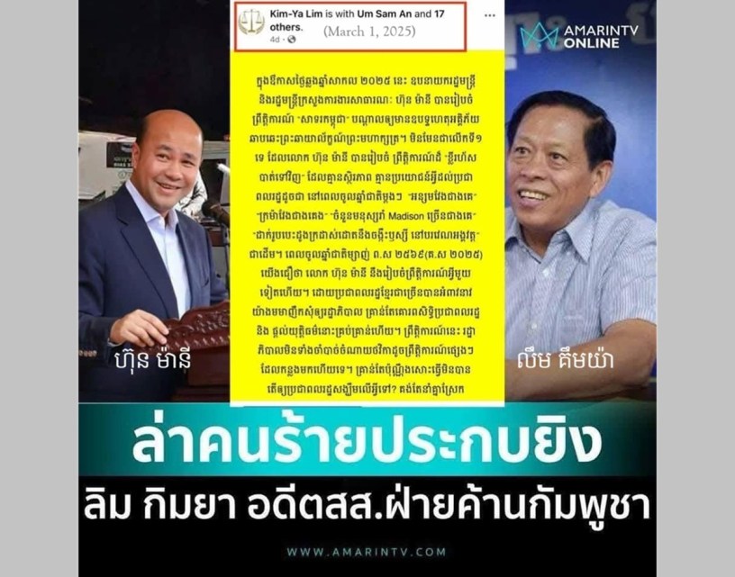 យើងខ្ញុំសូមថ្កោលទោសយ៉ាងដាច់អហង្ការ ចំពោះករណីឃាតកម្មលើរូបលោក លិម គឹមយ៉ា អតីតសមាជិកសភាកម្ពុជា ពីគណបក្សសង្គ្រោះជាតិ នៅទីក្រុងបាងកក ប្រទេសថៃ នាថ្ងៃទី៧ ខែមករា ឆ្នាំ២០២៥ បន្ទាប់ពីលោក និងគ្រួសារ ធ្វើដំណើរពីខេត្តសៀមរាប កម្ពុជា ចូលប្រទេសថៃ។
